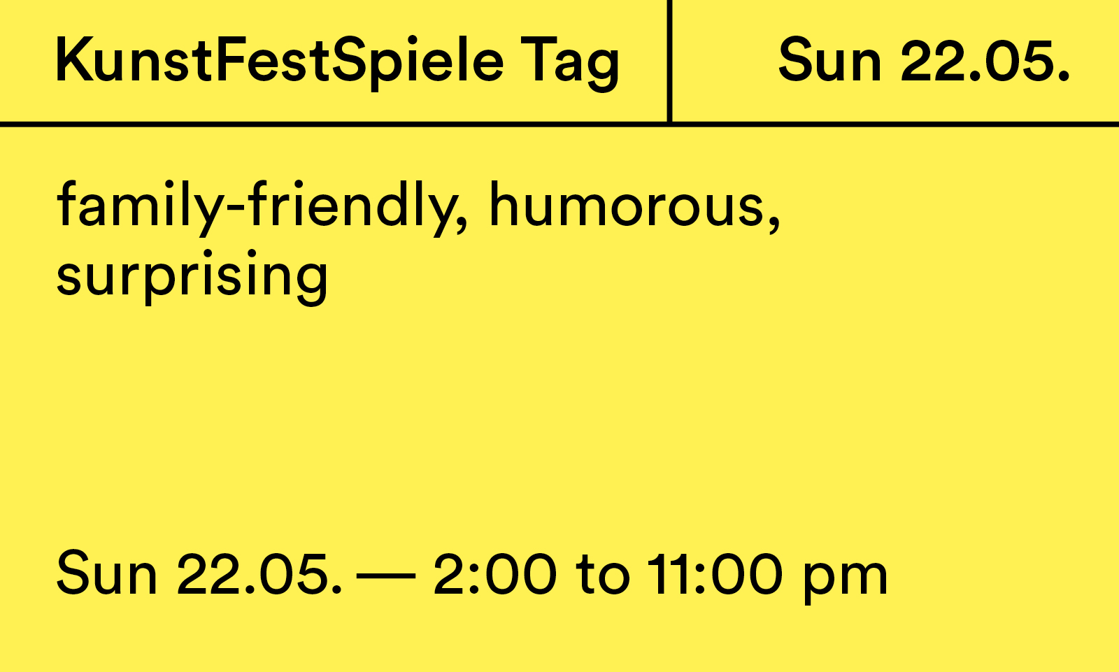 KunstFestSpiele Tag Sun 22.05. — 2:00 to 11:00 p.m. |