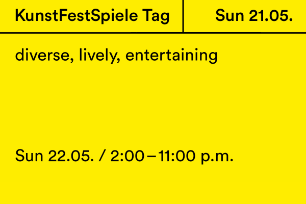 KunstFestSpiele Tag Sun 21.05. / 14:00 bis 23:00 |